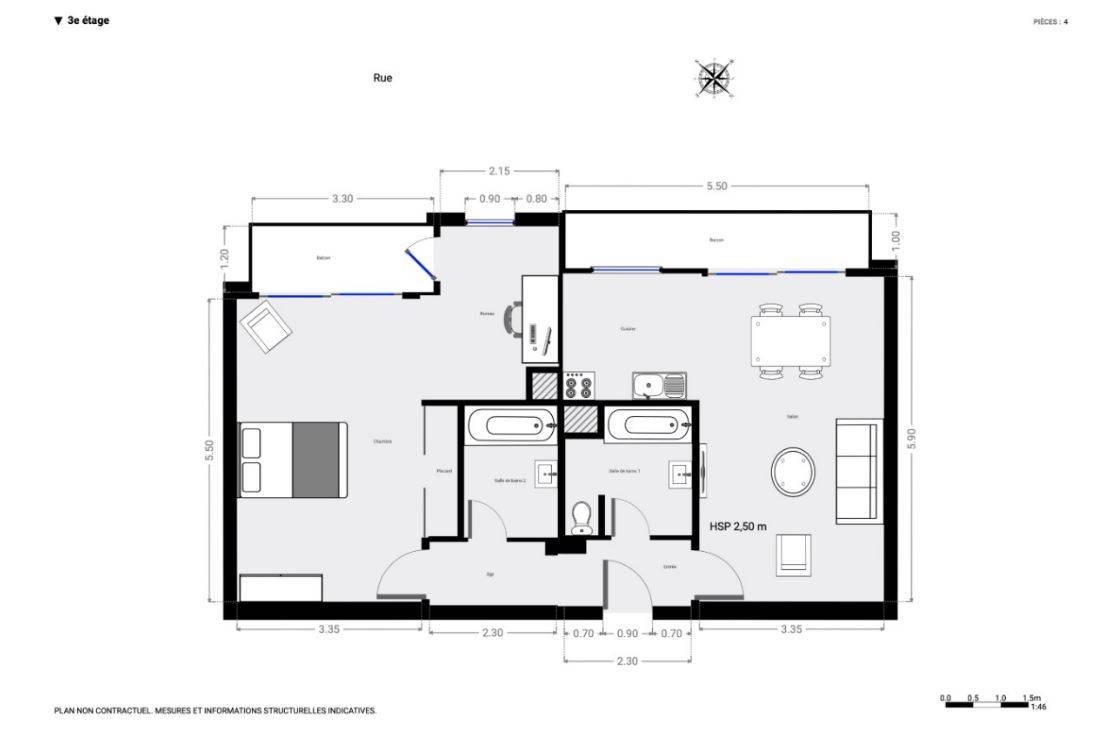 Surface loi carrez totale de 64,89m² et 2 balcons de 5,69m² et de 3,78m².