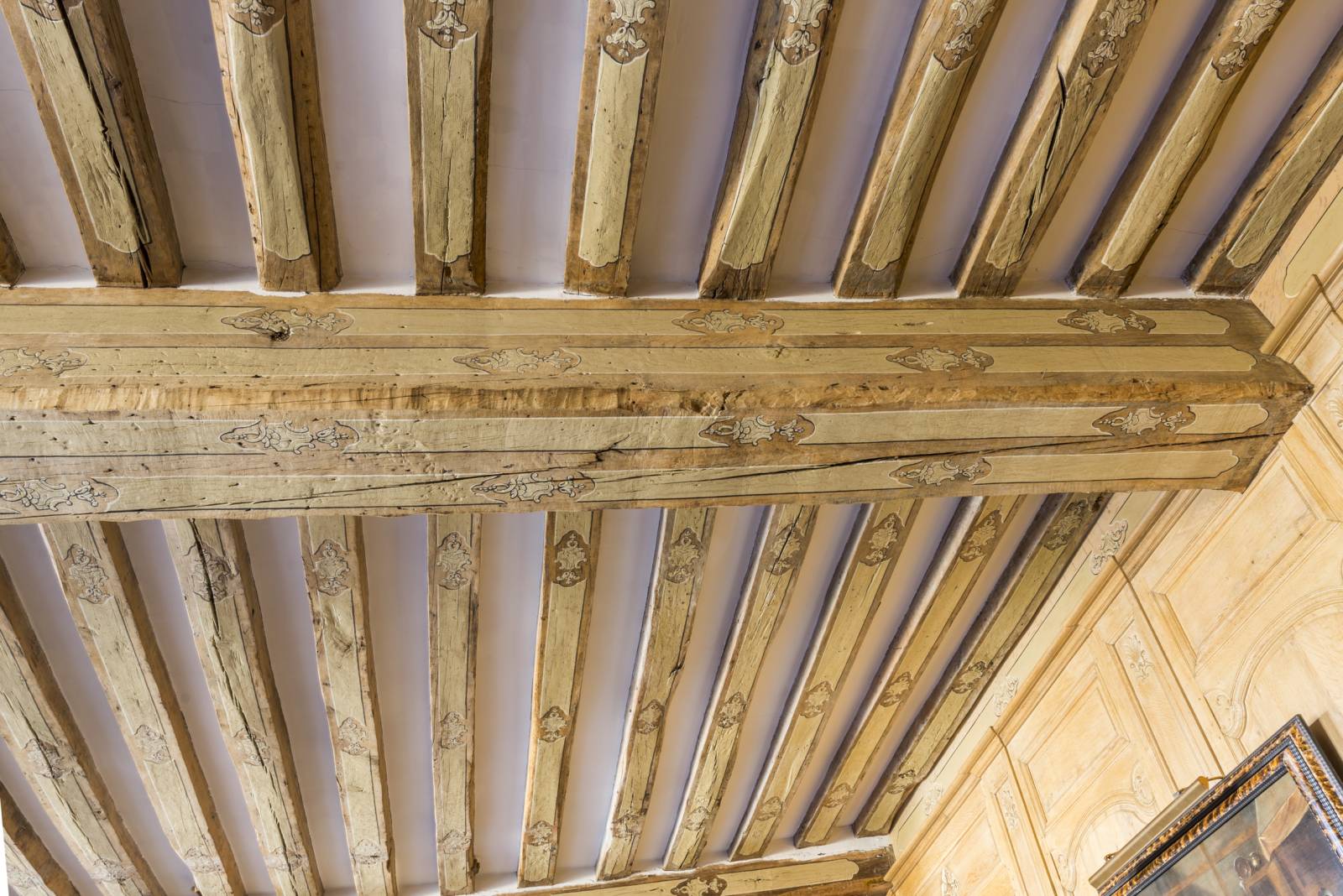 Ce bien est composé d'un vaste séjour au parquet Versailles et décoré de boiseries, de poutres peintes de motifs en trompe l'œil et de deux splendides cheminées.