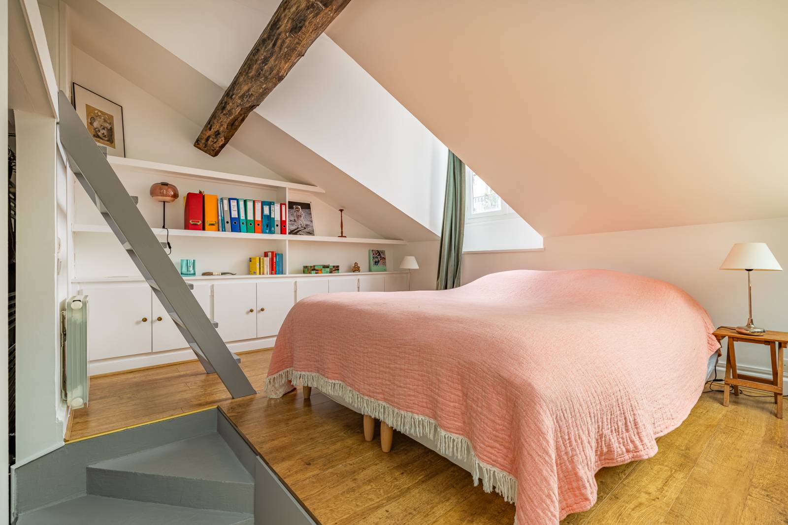 Ce bien lumineux et calme se distingue par son charme unique et ses volumes généreux. Il se compose d'une spacieuse pièce de réception, d'un espace bureau, d'une cuisine semi-ouverte, d'une chambre avec sa salle de bains, ainsi que de deux mezzanines modulables. Ces dernières offrent de nombreuses possibilités : bureau, rangements supplémentaires ou chambres d’appoint selon vos besoins. Des WC séparés complètent l’agencement, alliant confort et praticité.